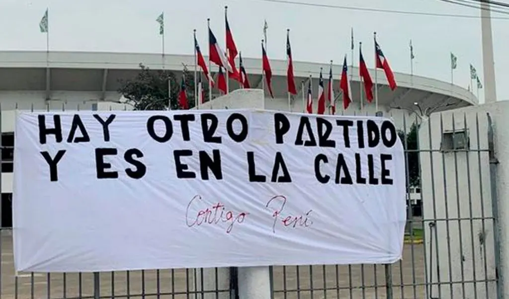 “Hermanos peruanos, hoy su partido más importante es en la calle. Así lo dejamos en claro en la entrada del Nacional. El pueblo de Chile está con Perú”, expresó un ciudadano chileno en su cuenta de Twitter. En la fotografía se puede ver una bandera con el mensaje “Hay otro partido y es en la calle. Contigo Perú”, en los exteriores del Estadio Nacional de Santiago.