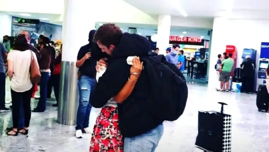 Justo cuando la mujer comenzaba a preocuparse, apareció un joven, que no era Fede pero le dio una pista para encontrarlo. Iris abrió bien grandes los ojos y salió corriendo rumbo al pasillo del gran salón y entonces sí lo pudo abrazar. Empleados del aeropuerto, taxistas, otros pasajeros, todos los que estaban allí en ese momento se emocionaron junto a ellos y aplaudieron el ansiado encuentro de los novios.