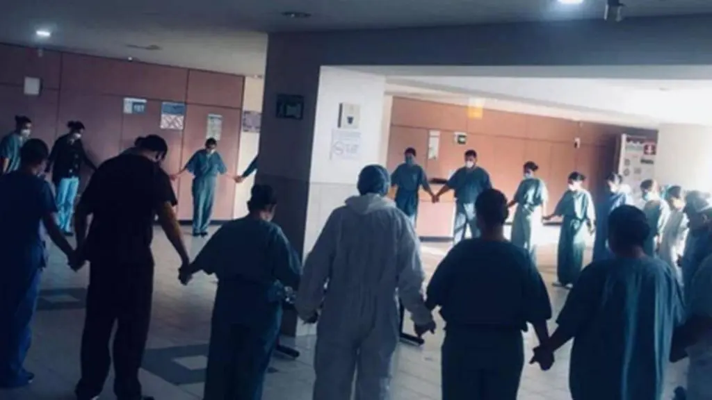 Trabajadores de la salud del Hospital Regional 1 del IMSS de Tijuana fueron captados rezando antes de iniciar sus labores para tratar pacientes infectados con la COVID-19.