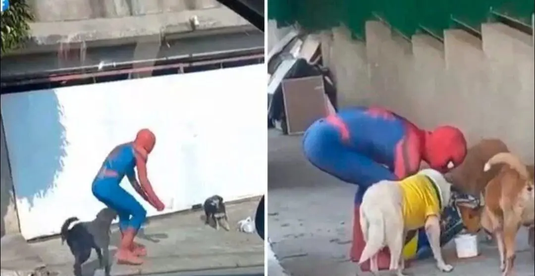 Con el característico traje azul y rojo del arácnido, él recorrió algunas calles donde se encontraban los animales abandonados para darles comida. El hombre cargó una enorme bolsa de comida para perros y uno a uno les entregó las croquetas en un plato de plástico.