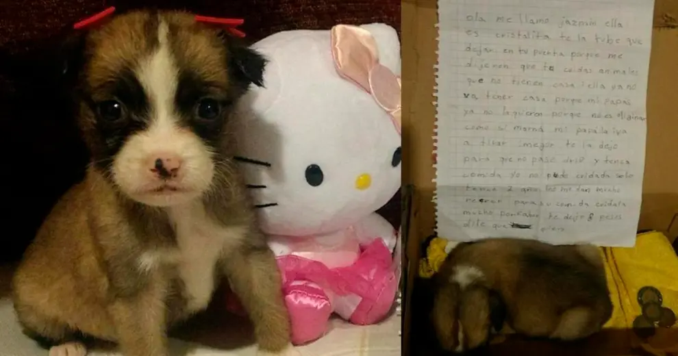 “Hola me llamo Jasmín y ella es Cristalita. Te la tuve que dejar en tu puerta porque me dijeron que tú cuidas animales que no tienen casa y ella ya no va a tener porque mis papás no la quieren porque no es original. Como mi mamá y mi papá la quieren tirar, mejor te la dejo para que no pase frío y tenga comida. Yo no puedo cuidarla, solo tengo 7 años y no me dan mucho de recreo para su comida. Cuídala mucho por favor, te dejo 8 pesos y dile que la quiero”.