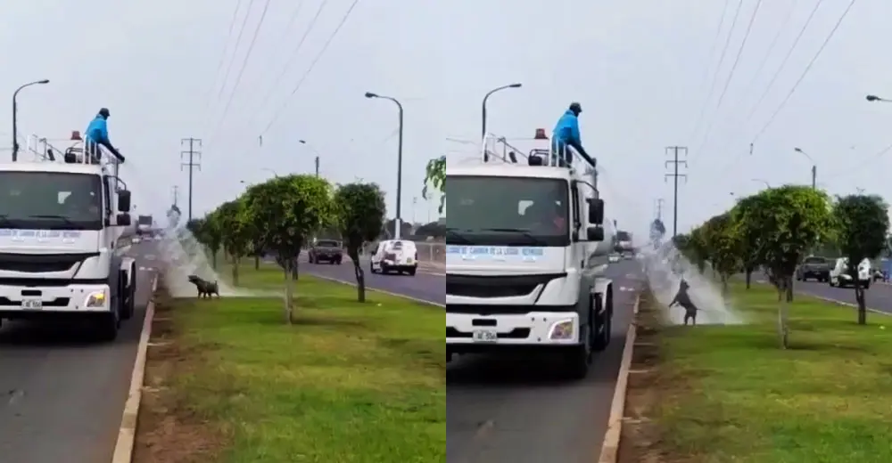 Un hombre, en la parte alta del vehículo, sujeta una manguera con la que esparce el agua en las áreas verdes. Esto es aprovechado por el can quien correr detrás del camión para dejar que le caiga el líquido.