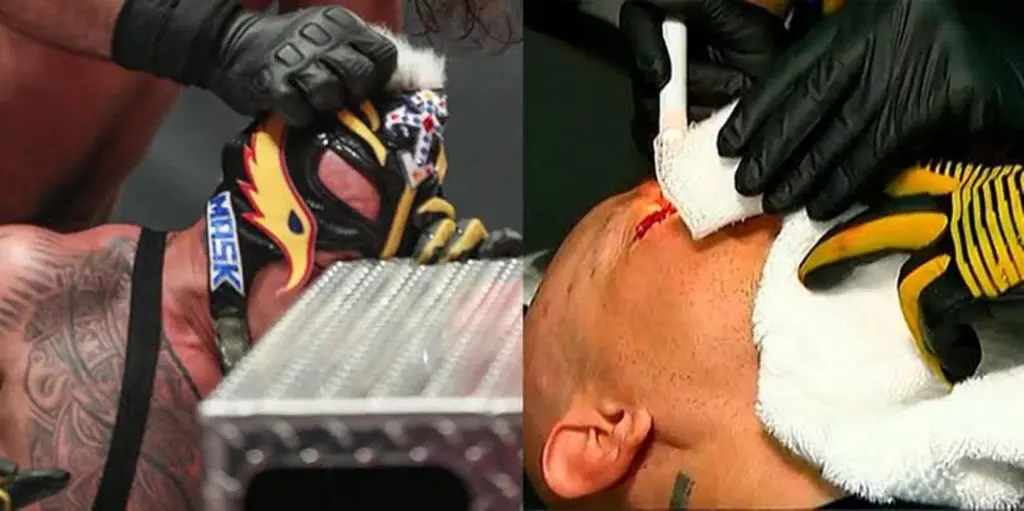 Durante una pelea en el #ExtremeRules de la WWE, Seth Rollins volvió a estrellar contra la escalera a Rey Misterio y lo volvió a lesionar severamente del ojo.