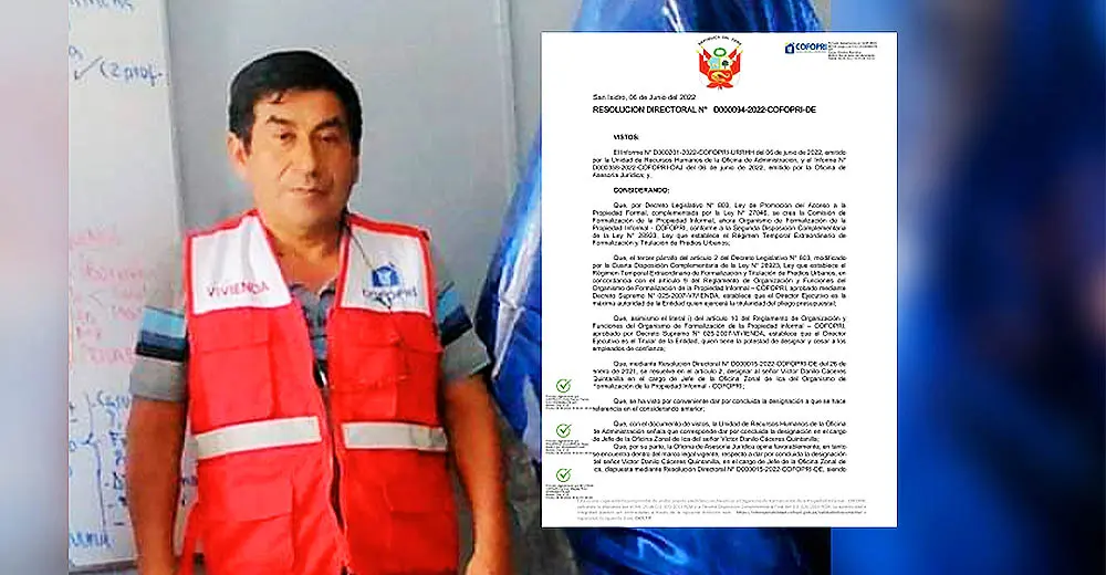 La resolución firmada por Jorge Luis Quevedo Mera, director efecutivo de COFOPRI, fue firmada con fecha 6 de junio, fecha en la cual fue el último día de funciones de Danilo Cáceres, quien a su vez estaría vinculado a la mafia de tráfico de terrenos.