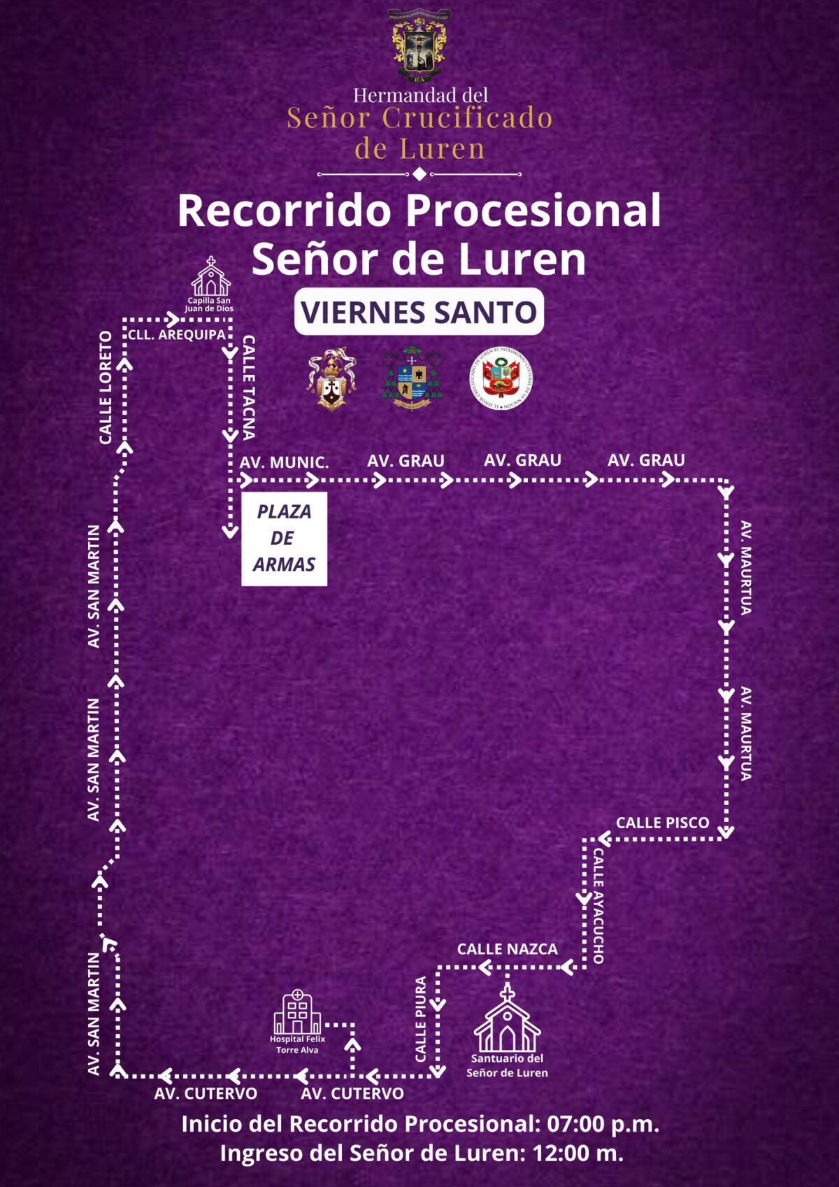 Por su parte, el recorrido procesional del Señor de Luren comenzará el viernes 3 de abril a las 7:00 p.m. desde la calle Nazca, avanzando por calle Piura, avenida Cutervo, avenida San Martín y avenida Ayabaca, en un extenso recorrido por diversas arterias principales de la ciudad.