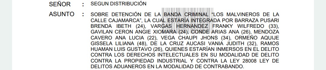 Entre los detenidos figuran Brenda Ibeth Barraza Pusari (24), Franky Wilfredo Vargas Hernández (33), Angie Xiomara Gavilán Ceron (24), Ana Conde Arias (26), Ana Lucia Mendoza Cavero (22), Jhons Vega Chaupi (34), Gissela Liliana Ormeño Aquije (48), Vania Judith De la Cruz Aucasi (32) y Luis Gustavo Ramos Huamán (26).
