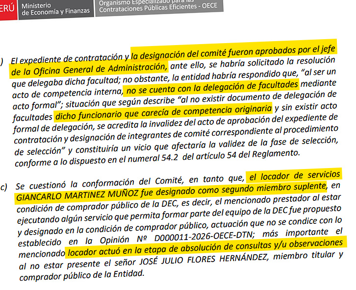 El OECE detectó un vicio grave en el origen del proceso. El expediente de contratación y la designación del comité de selección fueron firmados por el Jefe de la Oficina General de Administración, pero la propia municipalidad reconoció que no existe un acto formal que le delegue esas facultades. Sin esa delegación, la aprobación carece de sustento legal y podría invalidar toda la licitación.