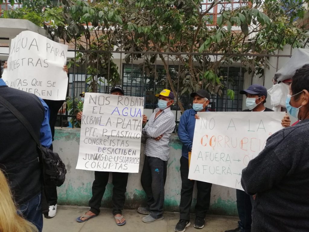 Parceleros de la provincia de Chincha realizaron esta mañana un plantón en la sede de la Junta de Usuarios del Riego del Valle de Chincha, protestando por la falta de agua para irrigar sus cultivos y denunciaron supuestos malos manejos en la distribución del líquido elemento para la agricultura.