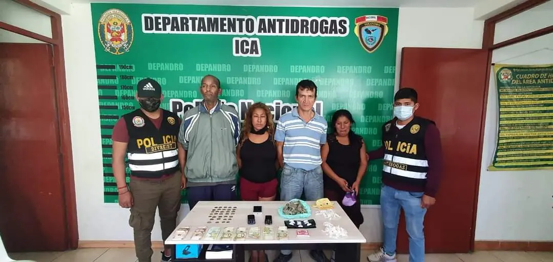 Personal de inteligencia de la policía luego de realizar el trabajo de seguimiento a un sujeto que al parecer se estaría dedicando al tráfico ilícito de drogas y con el apoyo de efectivos del área antidrogas de la PNP (AREANDRO) desarticularon una banda delictiva llamada “Los Batuteros del Chota”. Uno de los intervenidos presenta antecedentes por el mismo delito y fue intervenido hace poco por los mismos agentes de la AREANDRO en flagrancia delictiva. Información policial, indica que un sujeto de tez morena y de contextura delgada se encontraba conversando con hombre quien estaba a bordo de una moto lineal, quien le entrego una bolsa verde que al parecer contenía sustancias ilegales, al notar la presencia policial ambos emprendieron la fuga, el conductor de la moto con rumbo desconocido y el sospechoso de tez morena ingreso a una vivienda ubicada en jirón Chota. El personal policial ingresó para capturarlo, al realizarle el registro personal encontraron entre sus prendas 09 bolsas tipo chupeteras con una sustancia similar a la pasta básica de cocaína, el detenido fue identificado como Henry Olivos Romano (59) alías “Shagy”. En la vivienda los miembros de la AREANDRO intervinieron a Víctor Manuel Arangon Figari (49) alías “Yogi”, María Ysabel Gómez Lozano (30) alías “Chabela” y Susana Martínez Cortez (43) alías “Gringa”, al realizar el registro del domicilio los agentes del orden encontraron 1 bolsa de plástico grande que contenía en su interior 41 bolsitas tipo globos con un polvo blanquecino similar al PBC. Asimismo 21 bolsitas tipo chupeteras con la misma sustancia y 28 bolsas de plástico con hojas, ramas y tallos secos al parecer marihuana, todos fueron conducidos hasta la sede de la AREANDRO de donde serán puestos a disposición del Ministerio Público.