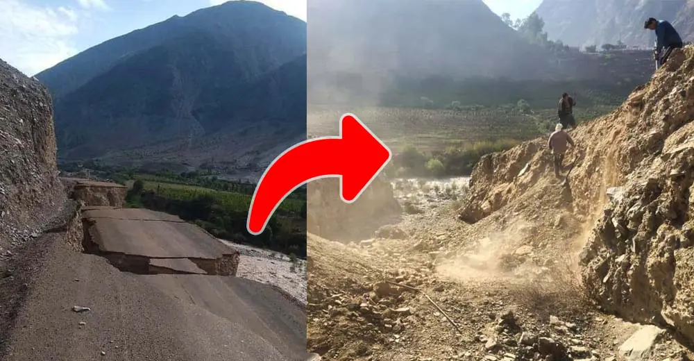 Tras el derrumbe de una carretera, ubicada Huancano, Pisco, región Ica, a causa de las intensas precipitaciones pluviales, los pobladores de Huayrani, que quedaron aislados, realizaron arduos esfuerzos para habilitar un camino peatonal provisional en un cerro.