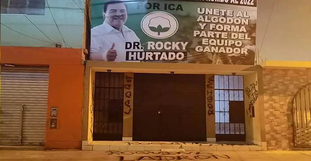 Han denunciado mediante las redes sociales que sujetos desconocidos, llegaron hasta el local del excandidato al gobierno regional de Ica, Rocky Hurtado, para atentar y colocar mensajes en contra de algunos integrantes de su equipo.