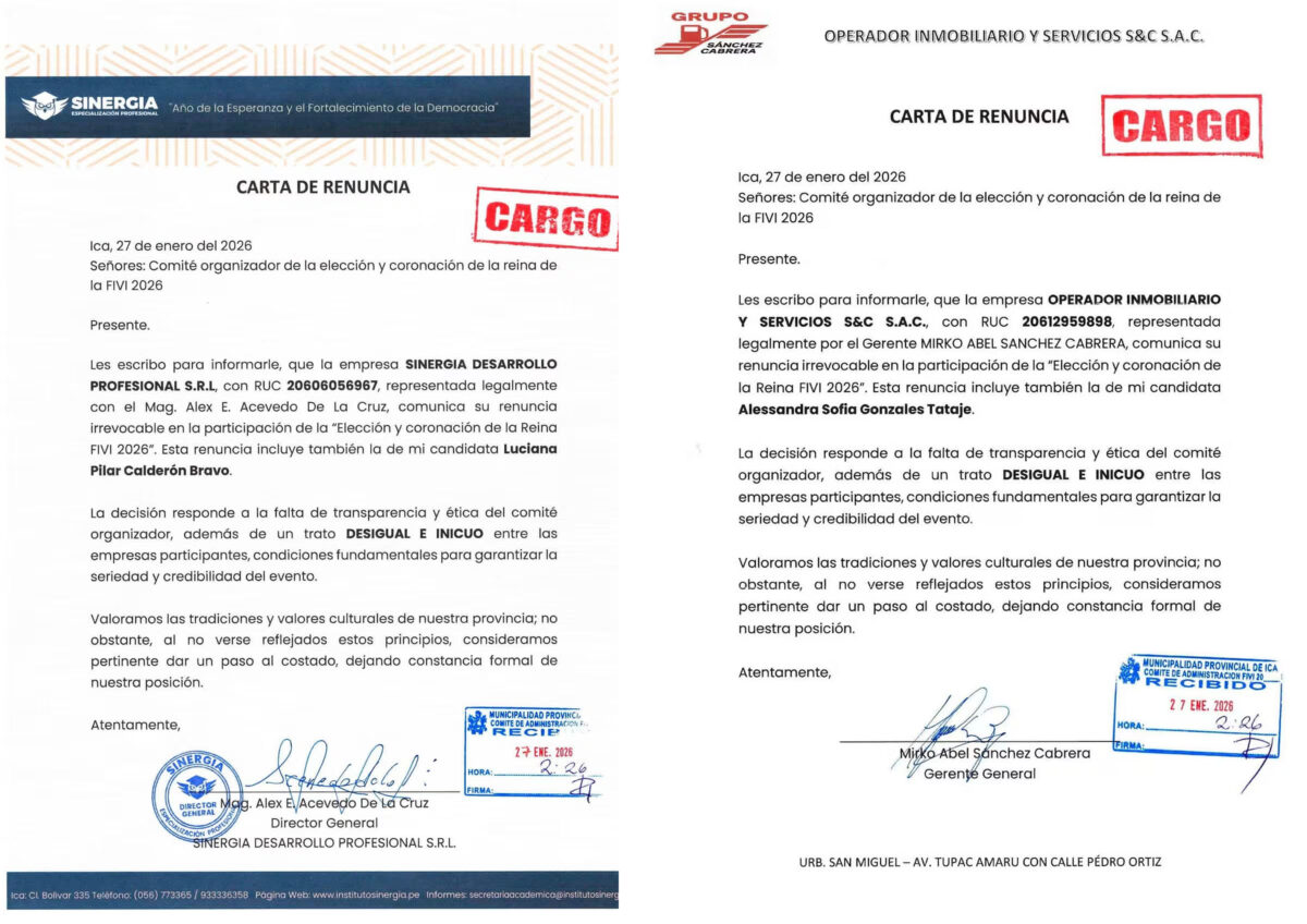 El Festival Internacional de la Vendimia Iqueña 2026 aún no ha iniciado y ya viene generando controversia tras la renuncia irrevocable de empresas privadas al tradicional certamen de belleza por la Elección de la Reina del FIVI, que retiraron a sus candidatas denunciando presuntas irregularidades en la organización. Las cartas, fechadas el 27 de enero de 2026 e ingresadas a la Municipalidad Provincial de Ica, confirman el retiro de Sinergia Desarrollo Profesional S.R.L. y Operador Inmobiliario y Servicios S&C S.A.C., reduciendo el número de participantes. Ambas empresas acusaron falta de transparencia, ética y trato desigual, señalando que estas condiciones afectan la credibilidad del concurso, justo cuando el reinado debería mostrar máxima exposición y promoción pública. Estas renuncias dejan fuera a la ya conocida belleza iqueña, Luciana Pilar Calderón Bravo. El represente de Sinergia, Alex Acevedo manifestó que "La decisión responde a la falta de transparencia y ética del comité organizador, además de un trato DESIGUAL E INICUO". También quedó fuera Alessandra Sofia Gonzales Tataje. A 48 horas de la presentación, el Reinado de la Vendimia de Ica pierde candidatas y auspiciadores. Regidores de la organización pierden empresas y participación de distritos en el FIVI 2026 La conducción del certamen recae en la regidora Ana María Huarcaya, presidenta de la Comisión Especial del FIVI 2026, y en el regidor José Luis Escate Espinoza, a cargo de la Subcomisión de Elección y Coronación, cuya gestión mantiene un perfil bajo pese a la cercanía de los actos oficiales. José Luis Escate aseguró previamente que se habían inscrito hasta 14 candidatas, mientras que Ana María Huarcaya declaró que las inscripciones ya fueron cerradas y que la participación distrital depende de cada alcalde, en respuesta a la escasa presencia de municipalidades distritales, tradicionalmente vinculadas a la identidad de las campiñas. A ello se suman cuestionamientos sobre la escasa difusión del reinado y la falta de información pública sobre el uso del presupuesto, incluidos aportes de Caja Ica y auspicios oficiales, mientras más empresas privadas intentarían posicionarse con fines de marketing. Pese al impacto público de las renuncias, la municipalidad mantiene la presentación oficial de candidatas este sábado 31 de enero en la Plaza de Armas de Ica.
