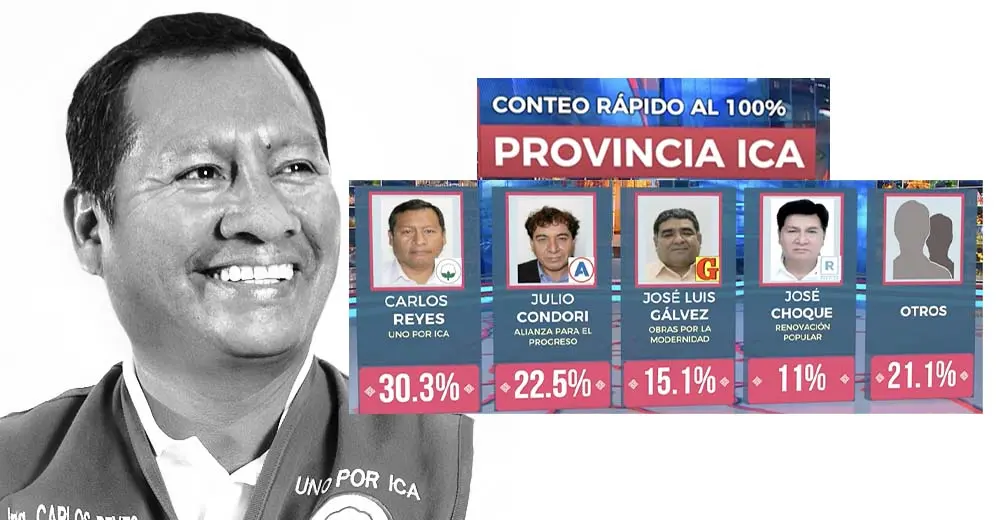De acuerdo al conteo rápido de IPSOS y América ya al 100%, a nivel de la provincia de Ica, el candidato Carlos Reyes, es virtual alcalde provincial tras obtener una clara ventaja sobre el segundo puesto.