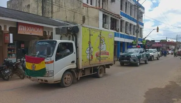 La parte delantera del vehículo llevaba una bandera boliviana y una wiphala, la ajedrezada y multicolor enseña de los pueblos indígenas, y a los costados se veía el logotipo de la empresa avícola.