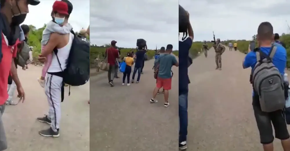 Uno de los militares tuvo que hacer disparos al aire para hacer retroceder al grupo de ciudadanos venezolanos, quienes había caminado con sus equipajes en el hombro y niños en brazo.