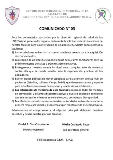 Emitieron su comunicado ante los comentarios suscitados por la Dirección Regional de Salud de Ica (DIRESA) y el gobernador regional de Ica ante la solicitud de las instalaciones de la facultad para la construcción de un albergue COVID-19.