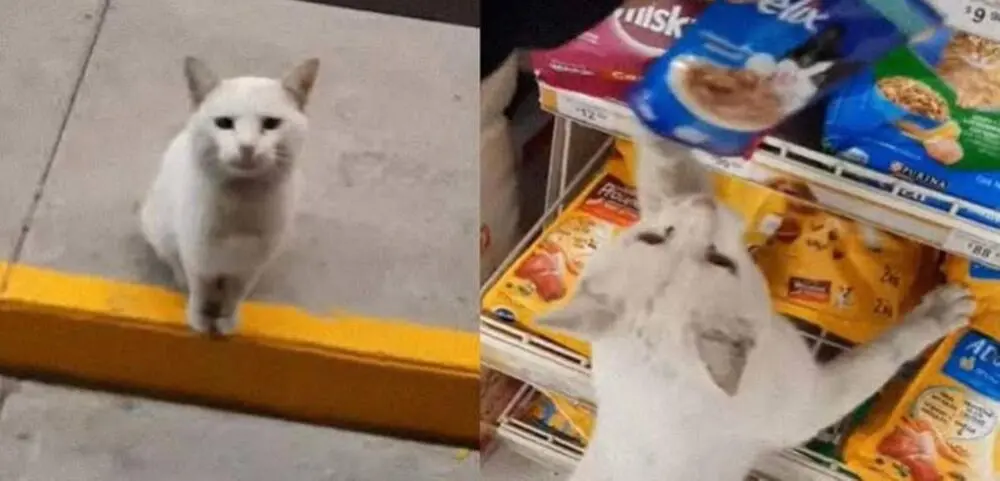 Gato callejero se para afuera de una tienda para que alguien le compre comida (VIDEO)