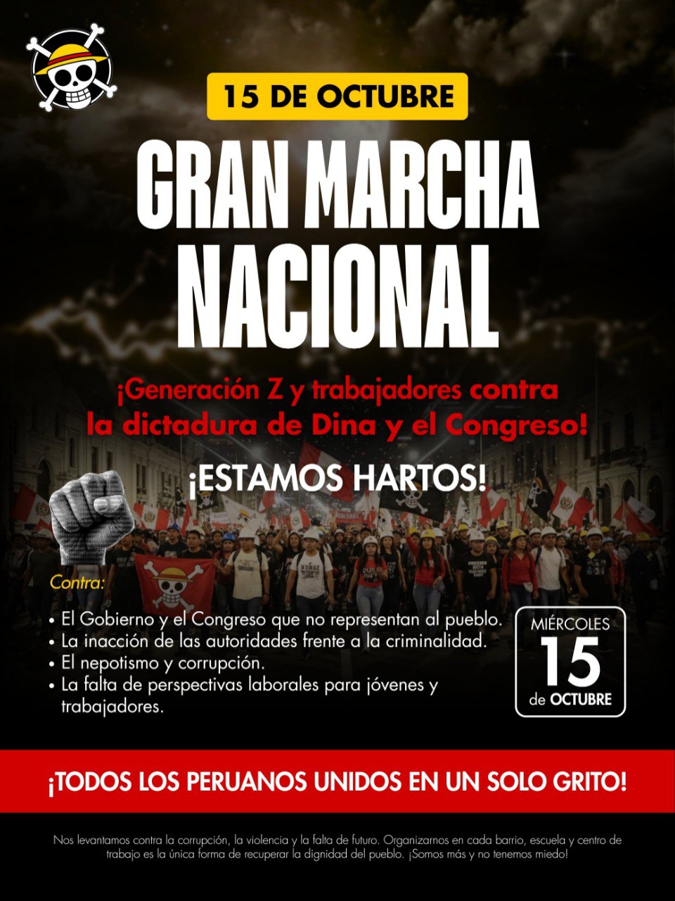 Generación Z convoca a nuevo paro nacional contra el Gobierno de Dina Boluarte el 15 de octubre