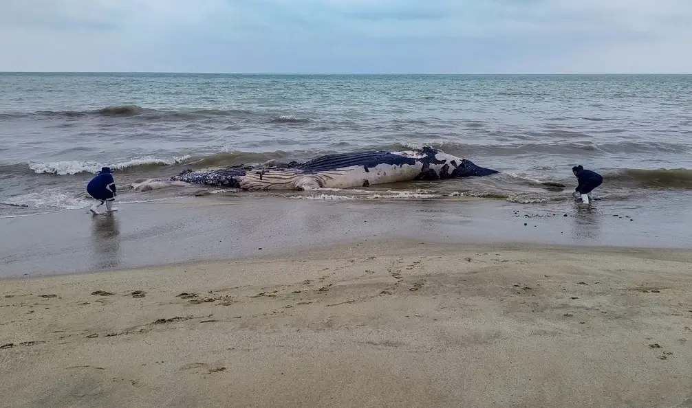 El Instituto del Mar del Perú (Imarpe) intervino ante el varamiento de una ballena jorobada en la playa arenosa de Malpaso, ubicada en el centro poblado Caleta Grau, provincia de Contralmirante Villar, Tumbes. Durante la inspección, el equipo técnico confirmó que se trataba de un ejemplar hembra de 12,67 metros de longitud, que se hallaba en avanzado estado de descomposición.