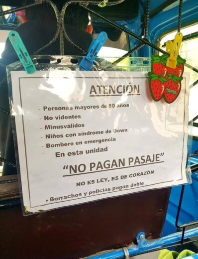 Sin embargo agrega una aclaración, donde especifica que los «Borrachos y policías pagan doble». Ha causado sorpresa, humor y buen mensaje por parte del mototaxista.