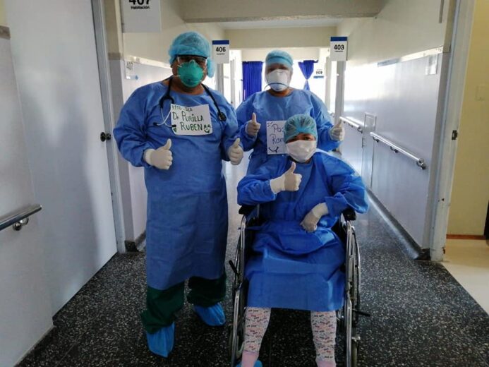 “hoy tenemos la dicha de contar con la primera alta de nuestra paciente hospitalizada en nuestro servicio de Covid19, con una evolución favorable, actualmente recuperada, con proceso bastante favorable durante su estadía en el hospital, es un honor laborar en este hospital, para realizar la labor que humanamente hacemos, es importante el apoyo emocional al paciente y es el que brindamos cada día todo el personal a nuestros pacientes”, manifestó el Dr. Ruben Purilla, médico tratante.