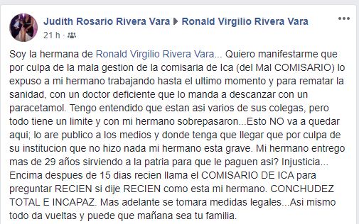 «Lo peor lo hacen trabajar hasta el último momento como lo hicieron con mi hermano Ronald Virgilio Rivera Vara. Si señores a mi hermano a pesar de presentar todos los síntomas del Covid 19; su comisario de Ica lo hizo trabajar y hoy esta luchando por su vida en el Hospital de Emergencia de Villa el Salvador en el piso 4 cama 401 y con tan solo 49 años de edad y 29 años de servir al Peru»