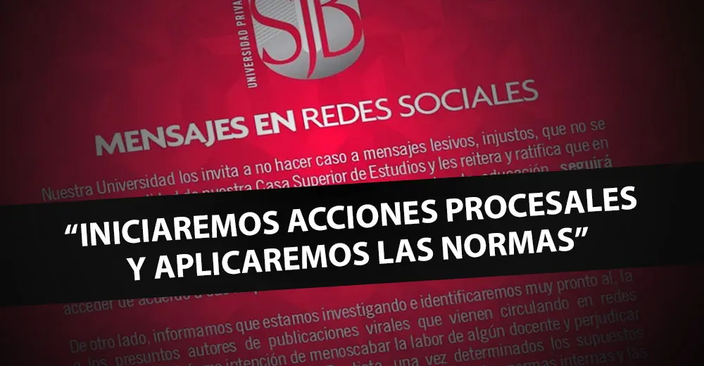 Asimismo «Informamos que estamos investigando e identificaremos muy pronto al, la o los presuntos autores de publicaciones virales que vienen circulando en redes sociales con la infame intención de menoscabar la labor de algún docente y perjudicar a la Universidad Privada San Juan Bautista, una vez determinados los supuestos responsables, iniciaremos acciones procesales y aplicaremos las normas internas y las que puedan corresponder a las faltas incurridas, en resguardo al respeto de nuestra institución y al prestigio de sus integrantes, estudiantes, egresados, docentes y autoridades».
