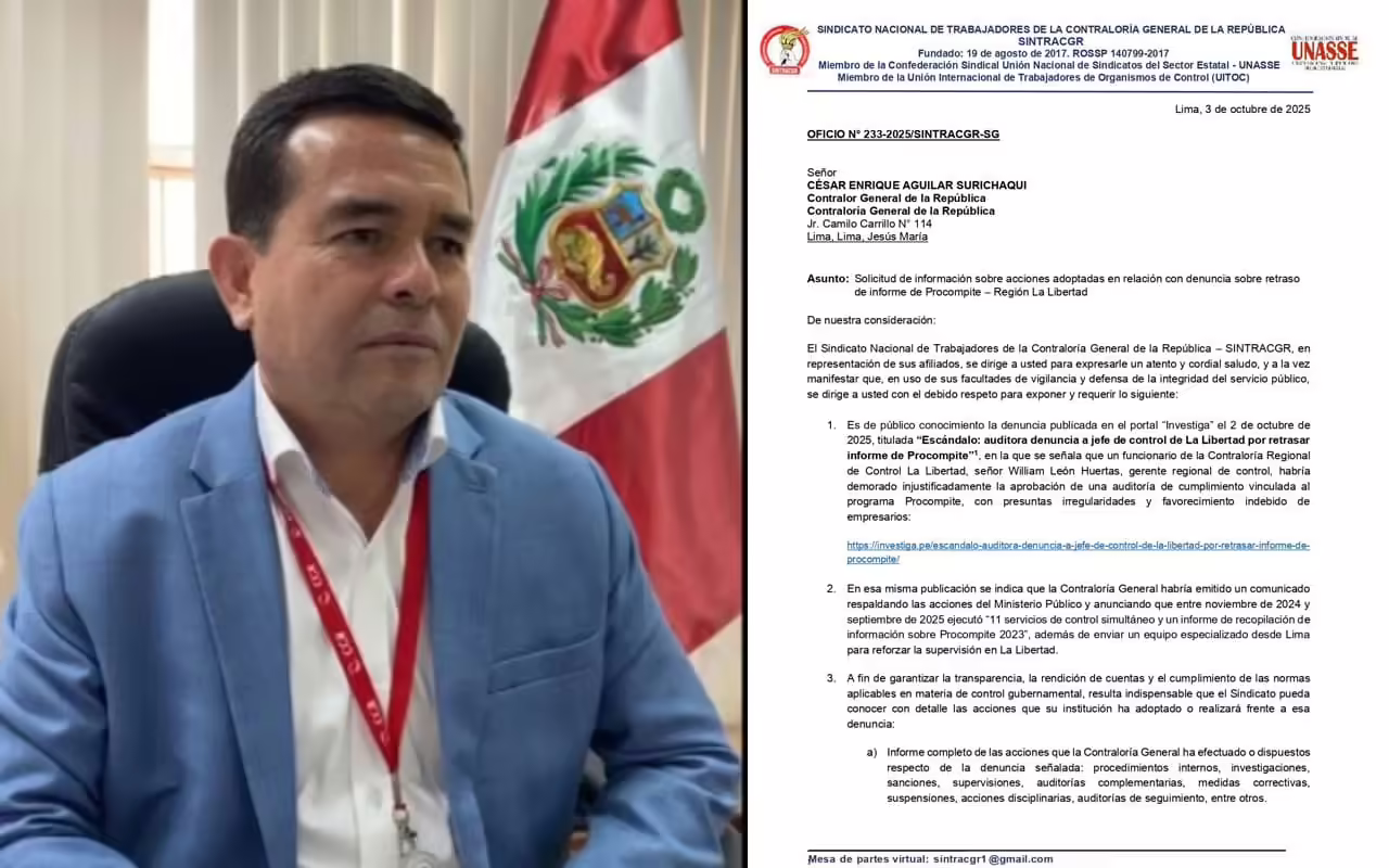 Tras los detalles expuestos por Investiga sobre el allanamiento fiscal a la sede de Control en Trujillo el pasado 1 de octubre, el Sindicato Nacional de Trabajadores de la Contraloría General de la República (Sintracgr) remitió el Oficio N° 233-2025/SINTRACGR-SG al jefe máximo de su institución para solicitarle un informe completo sobre las acciones adoptadas.