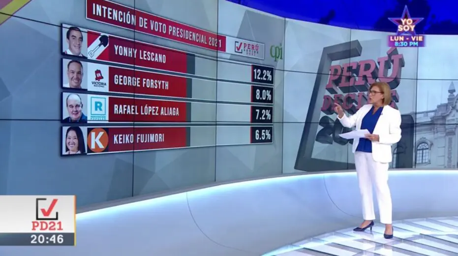 En la noche de este domingo 14 de marzo, Latina difundió los resultados de la última encuesta realizada por la Compañía Peruana de Estudios de Mercados y Opinión Pública (CPI) y los candidatos presidenciales Yonhy Lescano, con 12.2 %, y George Forsyth, con 8.0 %, lideran la intención de voto para las elecciones que serán el domingo 11 de abril del 2021.